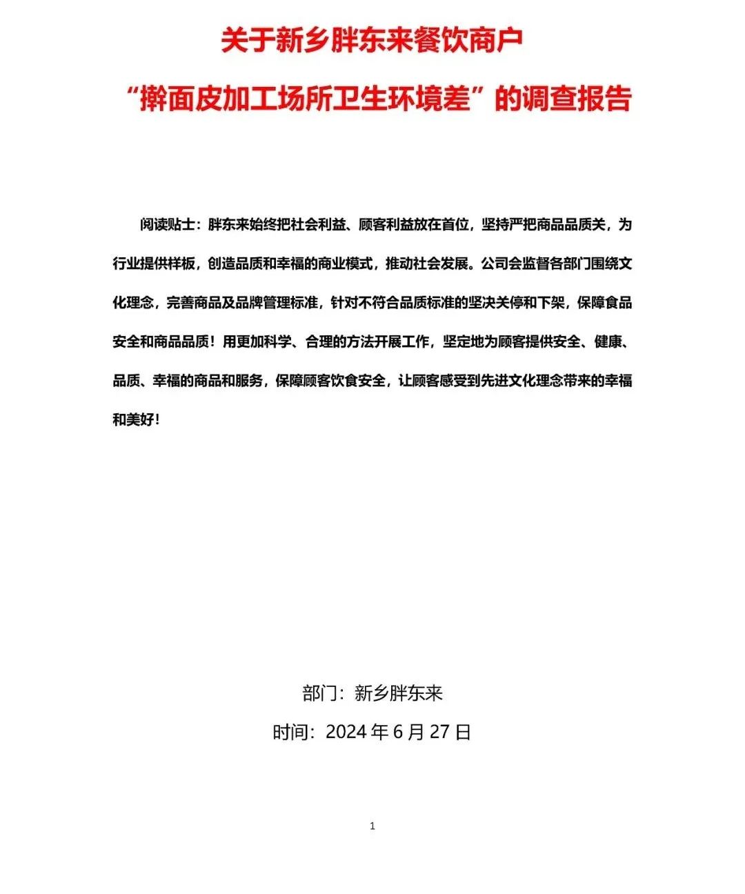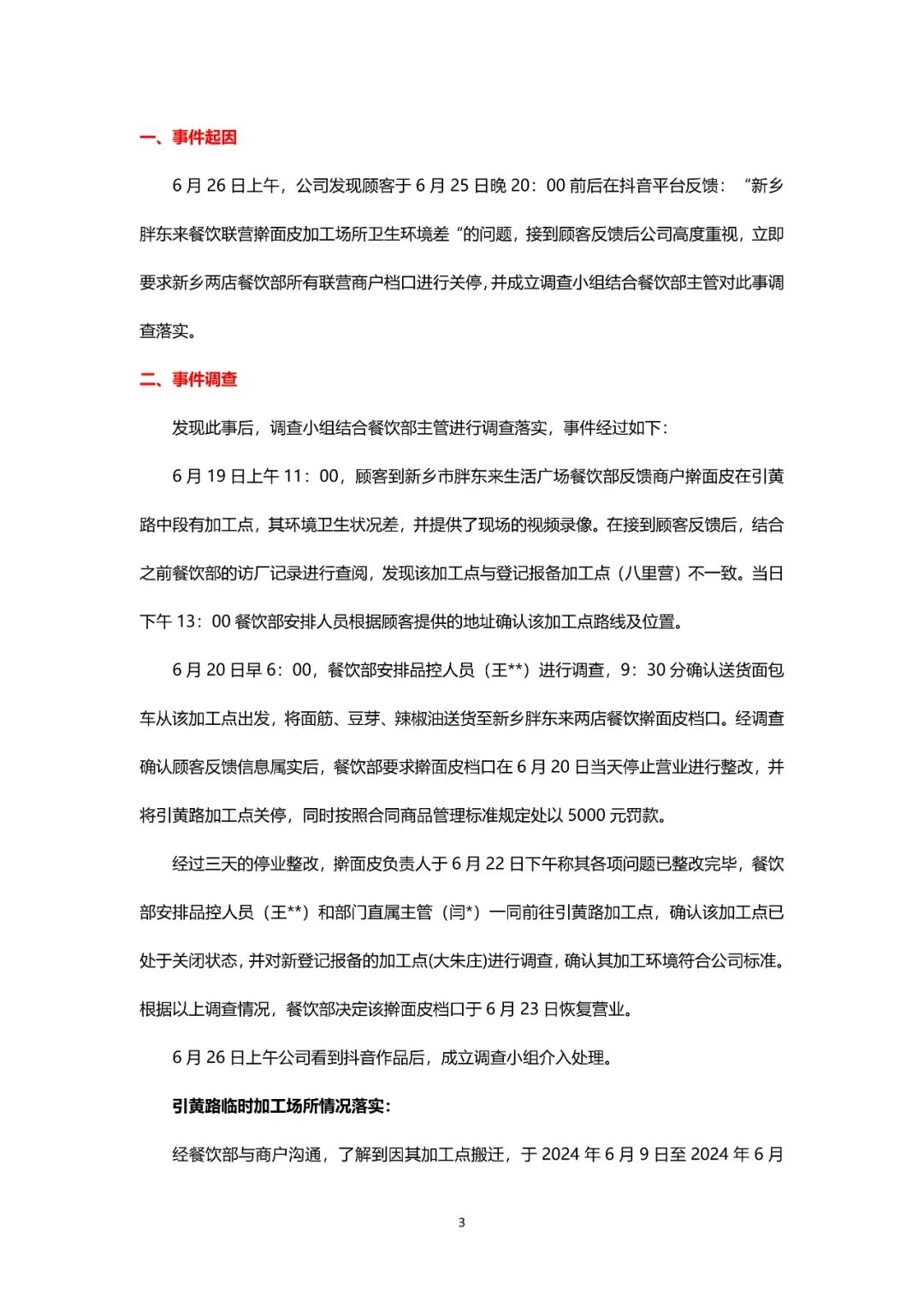 此前,有顾客于6月25日晚上在某短视频平台反馈,新乡胖东来联营餐饮“擀面皮”加工场所卫生环境较差的问题,接到顾客反馈后胖东来高度重视,立即要求新乡两店餐饮部所有的联营商户档口进行关停,并成立调查小组结合餐饮部门主管对此事进行严格调查落实。