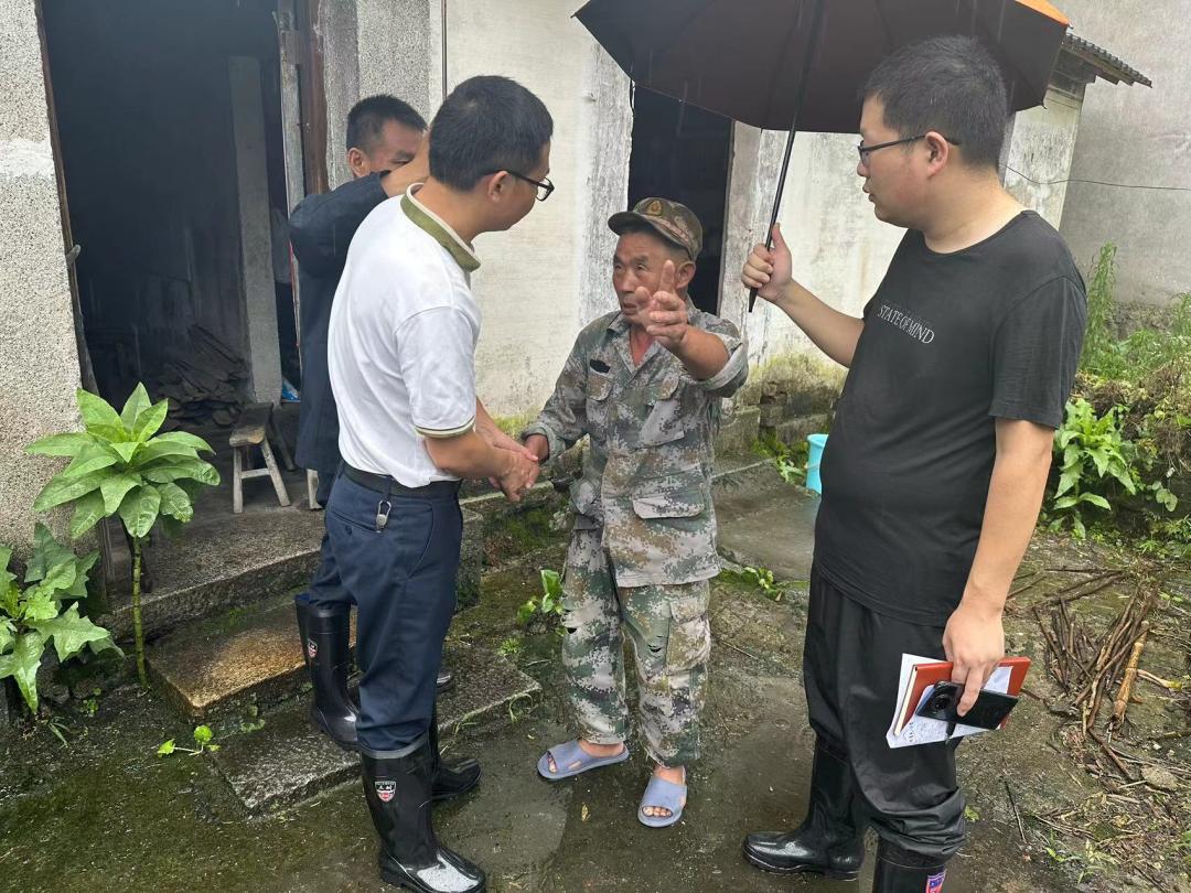 “感谢各位冒着大雨还来看望我们,你们也要注意安全。”孙村镇碧云村老人汪为宝握着姚卫华的手说道。6月27日上午,工作队紧盯危旧房屋、高陡边坡等重点部位,对村委会周边厚儒、上村片进行走访检查,在村“两委”干部陪同下检查群众房屋受损、饮用水情况,叮嘱日常用电安全。“各位大爷大娘,在宾馆住的还习惯吗?这几天都有雨,千万不要乱跑,有困难可以找我们帮忙”。在转移群众安置点,驻村工作队认真查看了转移群众的一日三餐和住宿环境,全力保障转移群众的生活需求。