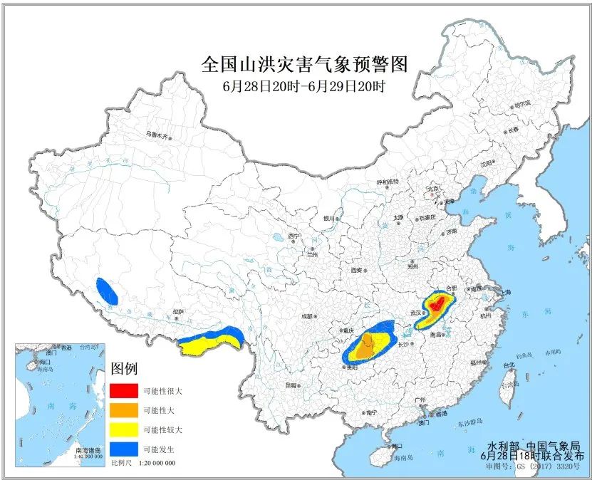 ■ 水利部和中国气象局28日18时联合发布红色山洪灾害气象预警:预计28日20时至29日20时,安徽西部、湖北东部、湖南西部、重庆南部、贵州东北部等地部分地区发生山洪灾害可能性大(橙色预警),其中,安徽西部、湖北东部局地发生山洪灾害可能性很大(红色预警)。