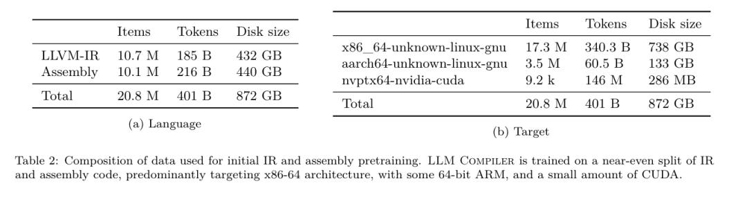 为了构建一个对这些语言有良好理解的 LLM,研究团队用 Code Llama 的权重初始化 LLM Compiler 模型,然后在一个以编译器为中心的数据集上训练 4010 亿个 token,这个数据集主要由汇编代码和编译器 IR 组成,如表 1 所示。
