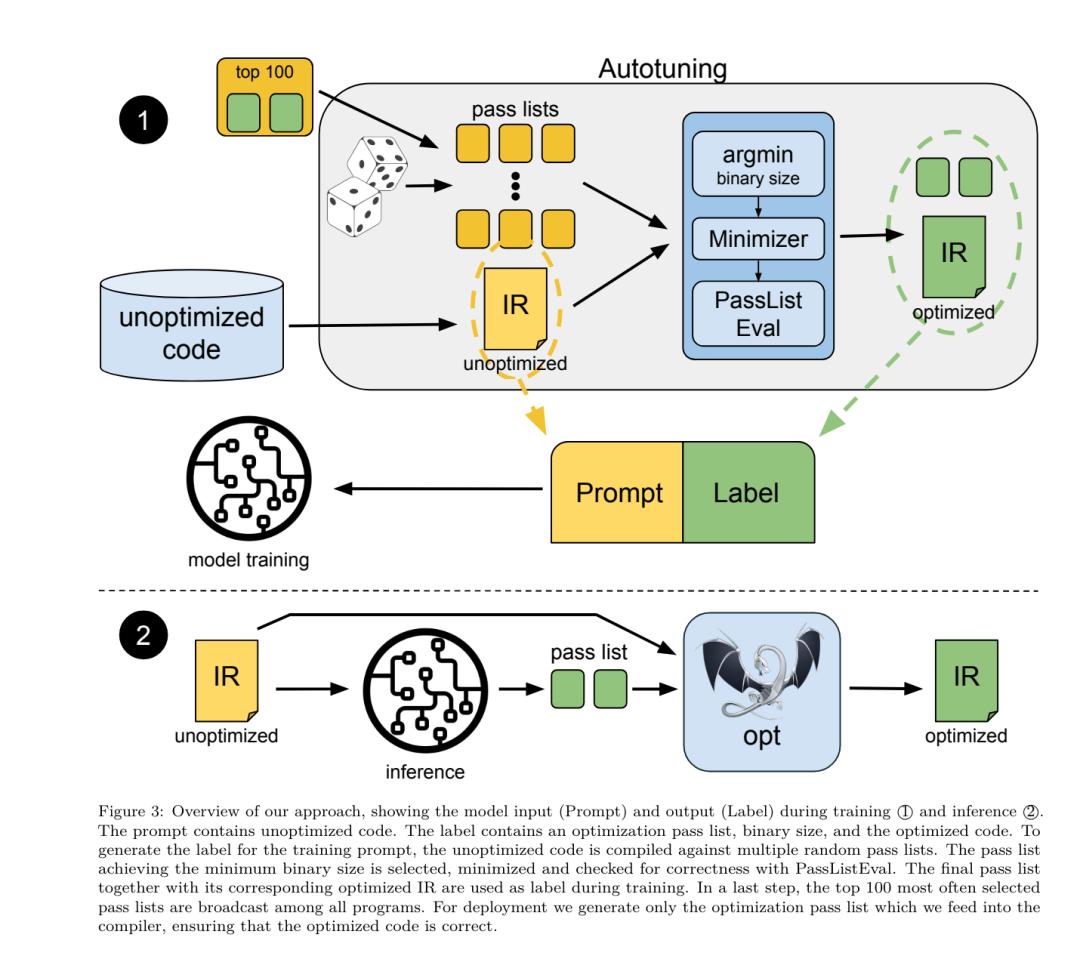 其思路是从有限的未优化种子程序集合中,通过对这些程序应用随机生成的编译器优化序列,生成大量示例。然后他们训练模型预测优化生成的代码,还训练模型预测应用优化后的代码大小。