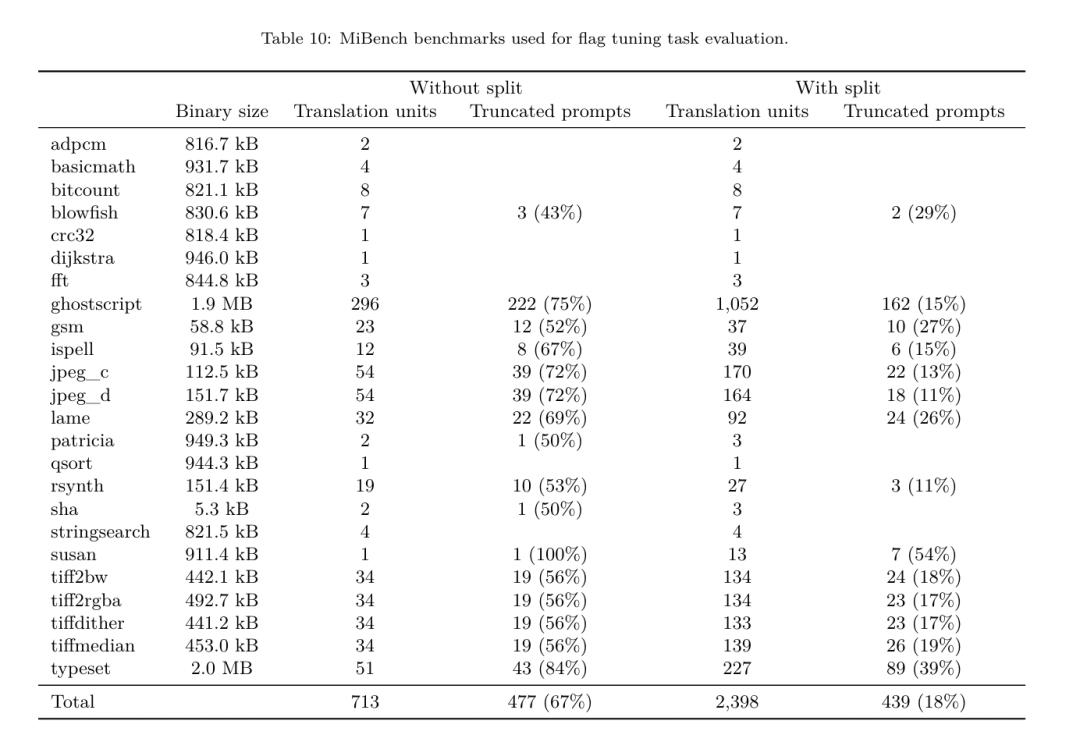 LLM Compiler 支持 16k tokens 的上下文窗口,但程序代码可能远远超过这个长度。例如,当格式化为标志调优提示时,67% 的 MiBench 翻译单元超过了这个上下文窗口,如表 10 所示。