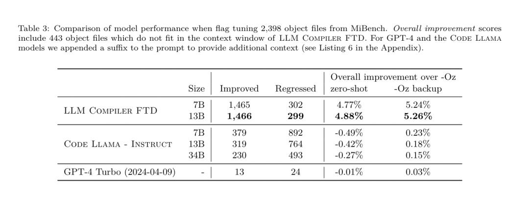 结果。表 3 显示了所有模型在标志调优任务上的零样本性能。只有 LLM Compiler FTD 模型比 -Oz 有所改进,13B 参数模型略优于较小的模型,在 61% 的情况下生成比 -Oz 更小的目标文件。