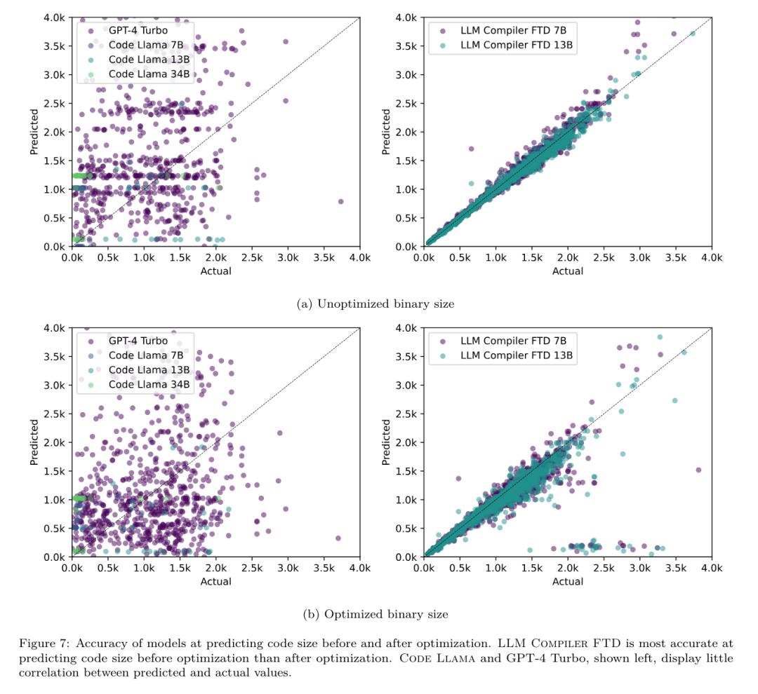 LLM Compiler FTD 的二进制大小预测与实际情况相关性良好,7B 参数模型对未优化和优化的二进制大小分别达到了 0.083 和 0.225 的 MAPE 值。13B 参数模型的 MAPE 值相似,分别为 0.082 和 0.225。Code Llama - Instruct 和 GPT-4 Turbo 的二进制大小预测与实际情况几乎没有相关性。研究人员注意到,LLM Compiler FTD 对优化代码的错误略高于未优化代码。特别是 LLM Compiler FTD 偶尔有高估优化效果的趋势,导致预测的二进制大小低于实际情况。