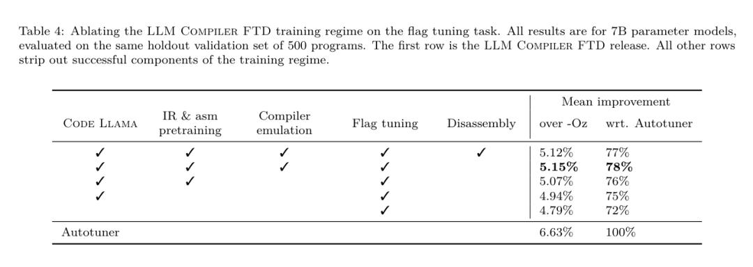 消融研究。表 4 对模型在 500 个提示的小型保留验证集上的性能进行了消融研究,这些提示来自与他们训练数据相同的分布 (但未在训练中使用)。他们在图 1 所示训练管道的每个阶段进行标志调优训练,以比较性能。如图所示,反汇编训练导致性能从平均 5.15% 略微下降到 5.12%(相对于 -Oz 的改进)。他们还展示了用于生成第 2 节所述训练数据的自动调优器的性能。LLM Compiler FTD 达到了自动调优器 77% 的性能。