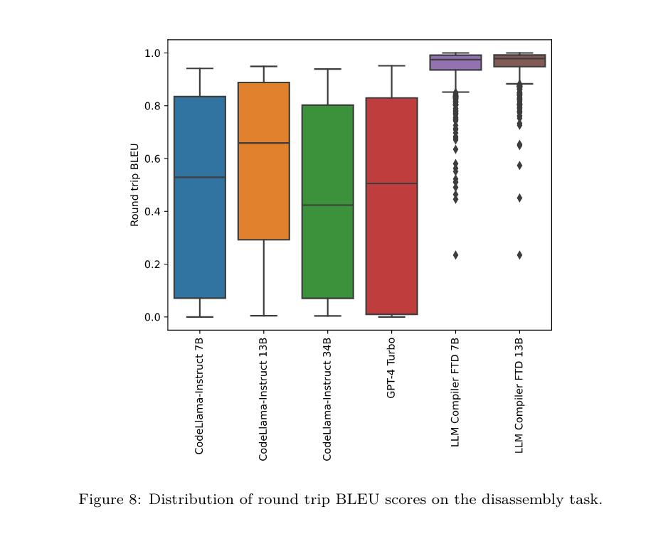 LLM Compiler FTD 7B 的往返成功率略高于 LLM Compiler FTD 13B,但 LLM Compiler FTD 13B 具有最高的往返汇编准确性 (往返 BLEU) 和最频繁产生完美反汇编 (往返精确匹配)。Code Llama - Instruct 和 GPT-4 Turbo 在生成语法正确的 LLVM-IR 方面存在困难。图 8 显示了所有模型的往返 BLEU 分数分布。