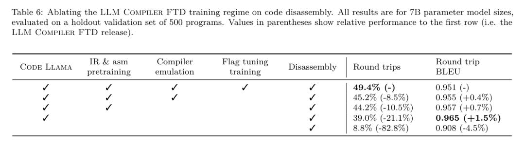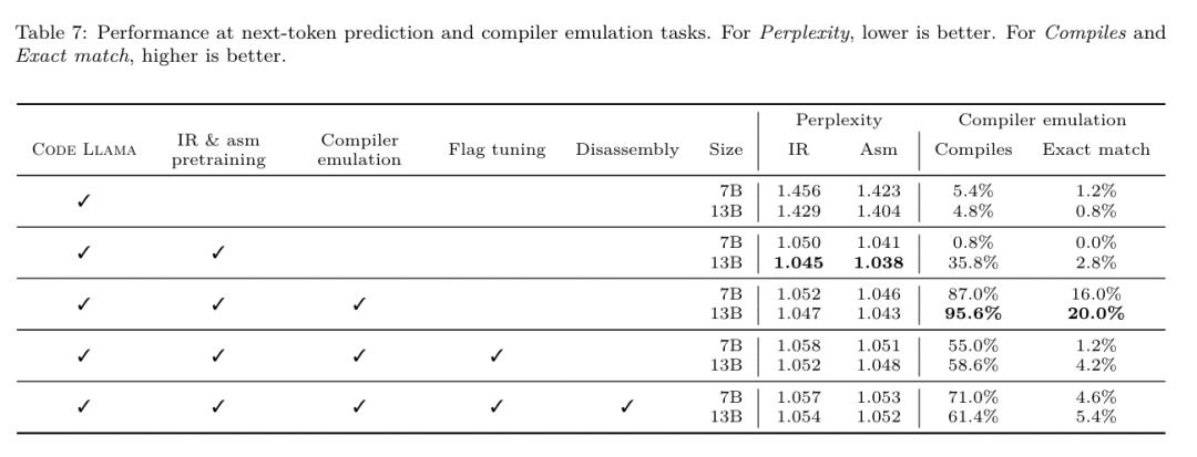 结果。表 7 显示了 LLM Compiler FTD 在所有训练阶段在两个基础模型训练任务 (下一个 token 预测和编译器模拟) 上的性能。下一个 token 预测性能在 Code Llama 之后急剧上升,后者几乎没有见过 IR 和汇编,并在随后的每个微调阶段略有下降。