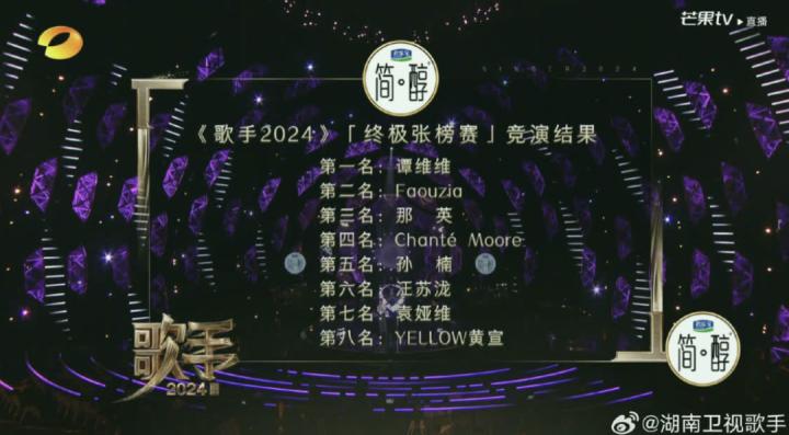 6月28日晚,《歌手2024》第八期终极张榜赛竞演结果揭晓:第一名谭维维,第二名Faouzia凡希亚,第三名那英,第四名香缇莫Chante_Moore,第五名孙楠,第六名汪苏泷,第七名TIA袁娅维,第八名YELLOW黄宣。
