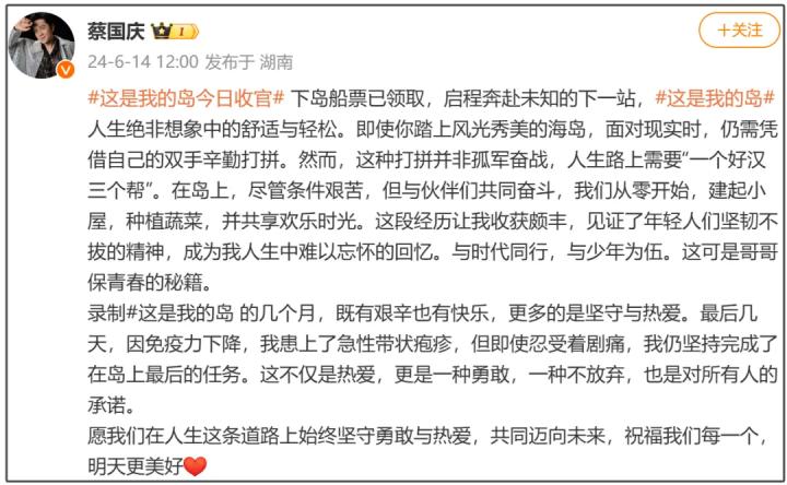 就在半个月前,歌手蔡国庆发文称在录制某综艺节目的过程中患上急性带状疱疹,忍着剧痛坚持完成了拍摄任务,引发不少网友担忧。