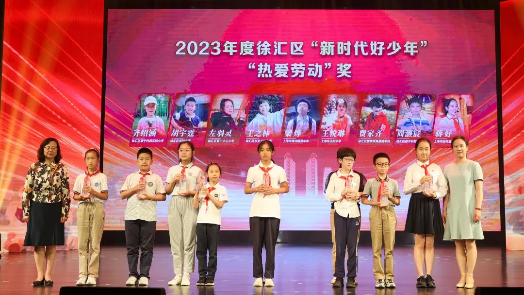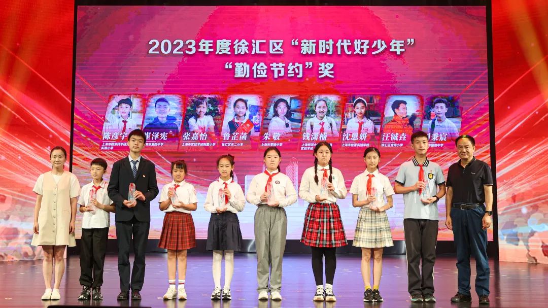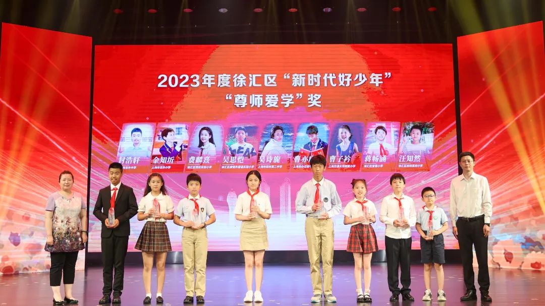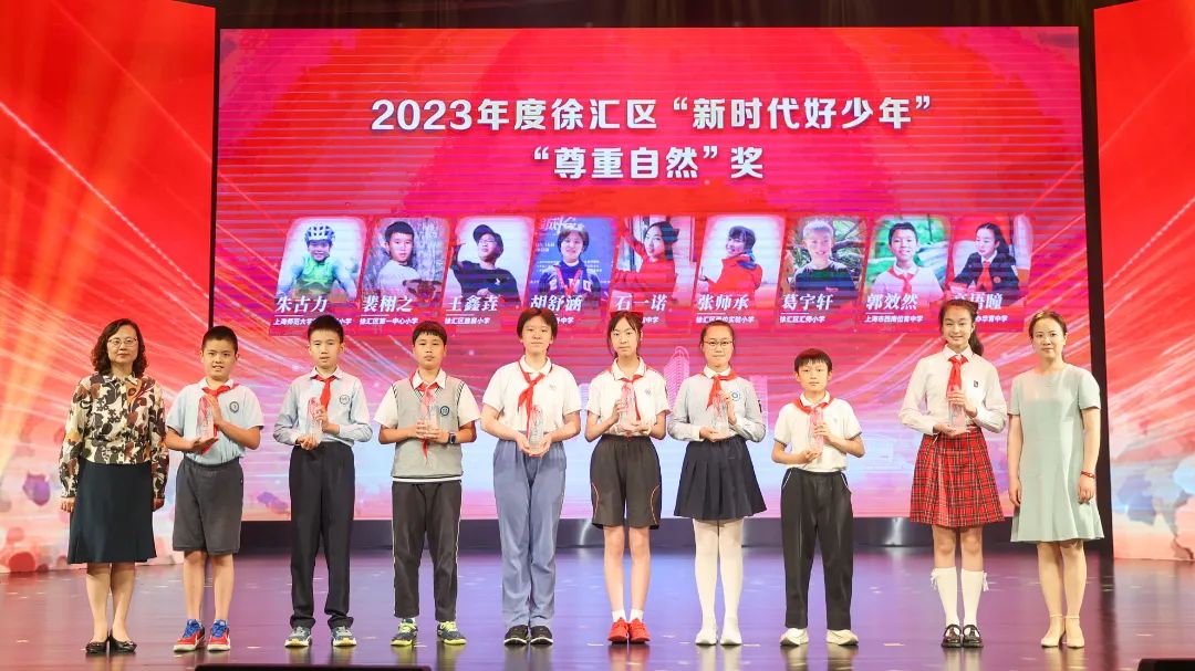 左右滑动查看更多在颁奖仪式上,获评2023年度徐汇区“新时代好少年”荣誉称号的121名同学,分别按“自尊自强”“明礼诚信”“正直勇敢”“勤俭节约”“尊老爱幼”“尊师爱学”“传承文化”“乐于助人”“热爱劳动”“尊重自然”十个奖项类别,分批次一一走向舞台接受荣誉。在热烈欢快的氛围中,十佳好少年和好少年团队成员手捧奖杯和证书,在台上满怀喜悦即兴分享感言和大家交流互动,他们用发自内心的纯朴言语传达了他们的追求。十佳好少年“尊重自然”奖获得者陈彦臻分享道:“和大自然做朋友是我们需要一直坚持的事,用科技创新的手段赋能环境保护,需要我们不断努力学习,深入思考并长久坚持下去。”