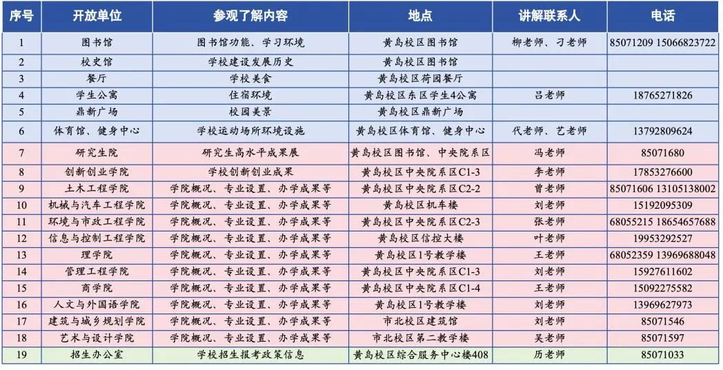 考生和家长可自行参观学校餐厅、教学楼、学生公寓、图书馆、风雨操场等,具体开放区域如下。