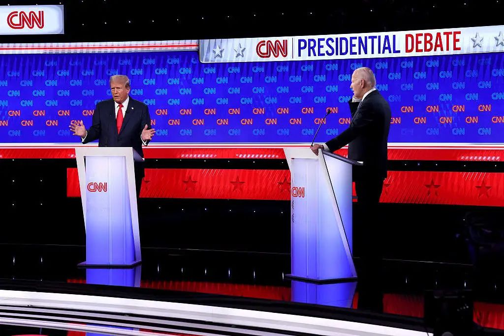 当地时间6月27日,特朗普和拜登进行2024年美国大选首场辩论(视觉中国)当地时间6月27日,拜登和他的竞争对手、美国前总统特朗普进行了2024年美国大选首场辩论。但辩论主办方美国有线电视新闻网(CNN)直言,拜登在辩论中表现糟糕,他声音嘶哑、说话结巴、语无伦次,甚至错过了攻击特朗普推翻2020年大选结果等行动的机会。