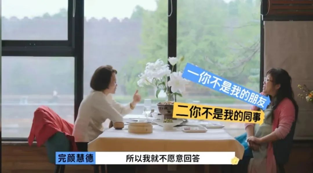 按照节目组安排,余秀华问起完颜慧德的婚恋状况,得到的答案却是:这是我的隐私。你不是我的朋友,也不是我的同事,我不愿意回答。