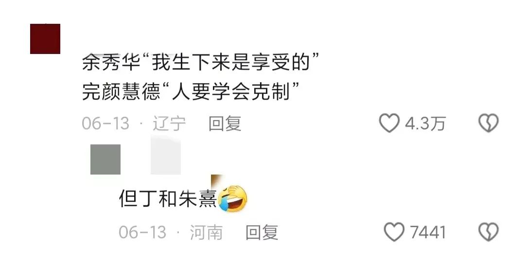 有网友觉得从作品成就和人生态度的角度看,余秀华的境界更难达到,所以层次更高。也有网友认为,二者都是矛盾体。余秀华是态度开放内核传统所以绕不过情爱三句不离男,完颜慧德是态度保守内核封建才会对欲望避而不谈。