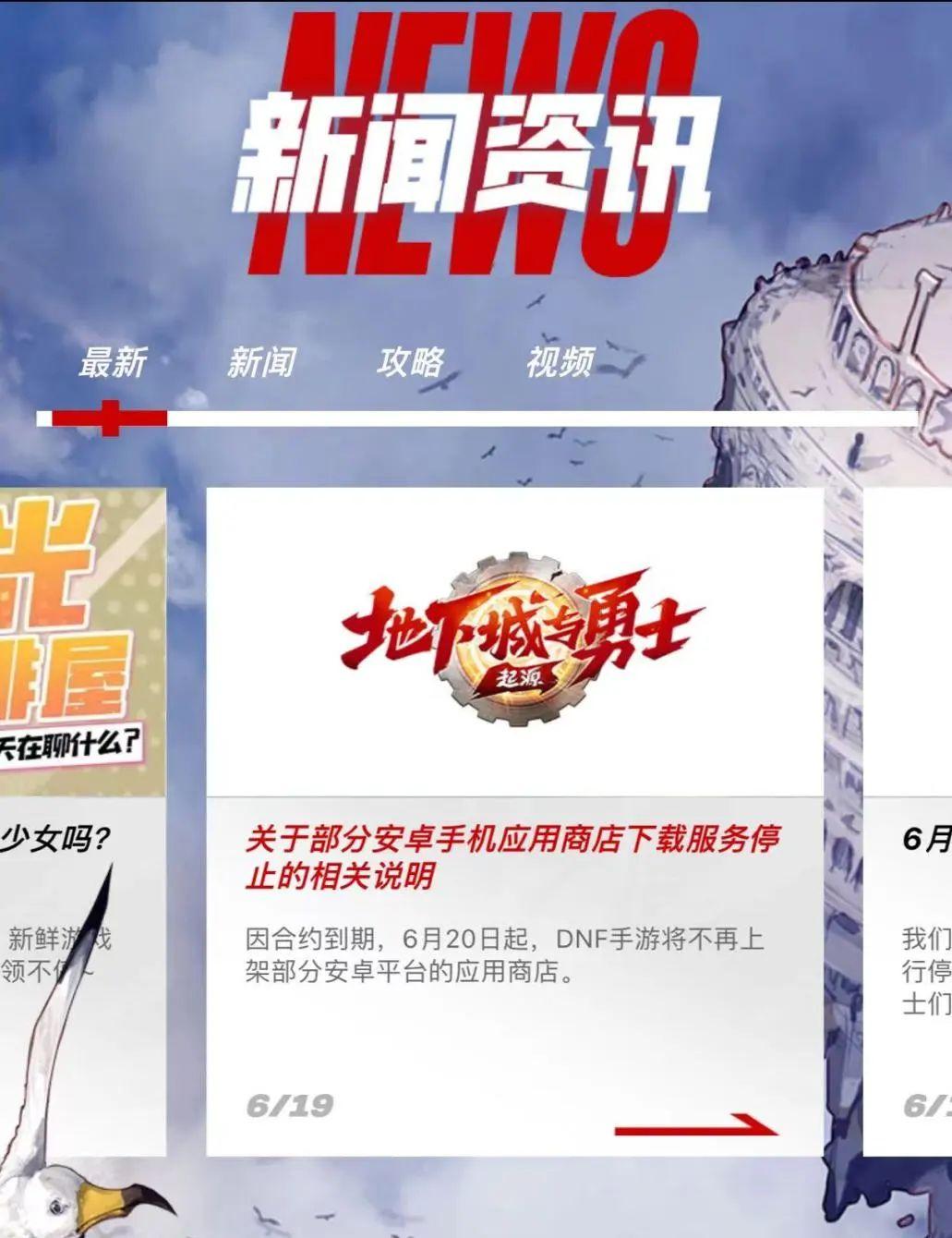 6月19日,腾讯旗下游戏《地下城与勇士:起源》(DNF手游)官网发布公告,不再上架部分安卓平台的应用商店。