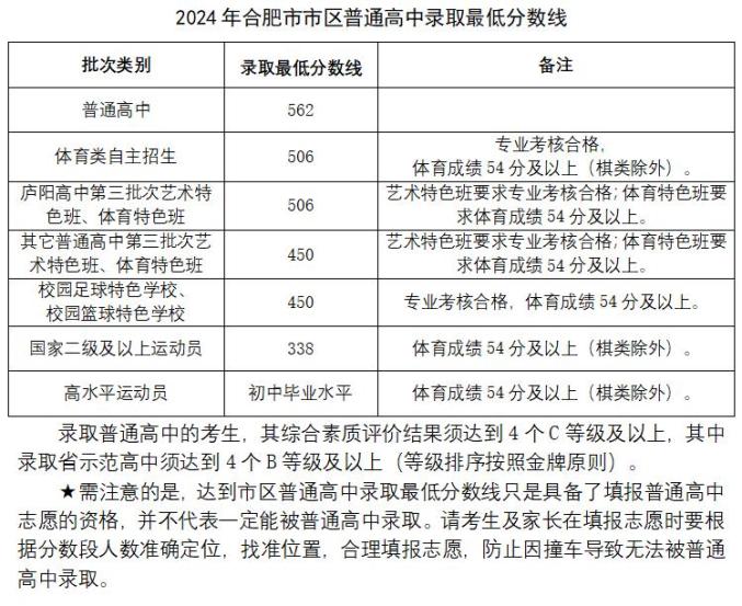 2024合肥市市区普通高中录取最低分数线