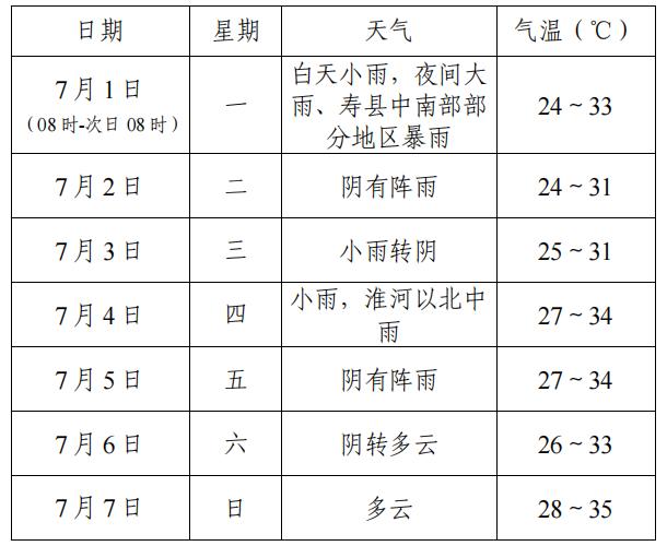 降水:预计未来七天我市多降水天气,其中1日夜间我市大部分地区大雨,寿县中南部部分地区暴雨,降水集中时段可能伴有雷电、7级左右阵风、短时强降水(20~30毫米/小时)等强对流天气;2-5日我市有分散性阵雨或雷雨,其中3日主雨带北抬至淮河以北地区,4日我市淮河以北中雨。