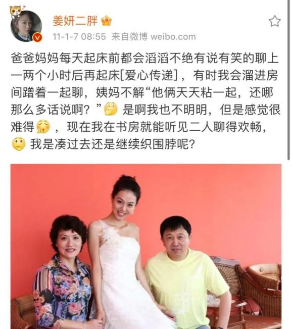 姜妍从小的家庭氛围和谐幸福,父母很相爱,家庭经济情况也不错。