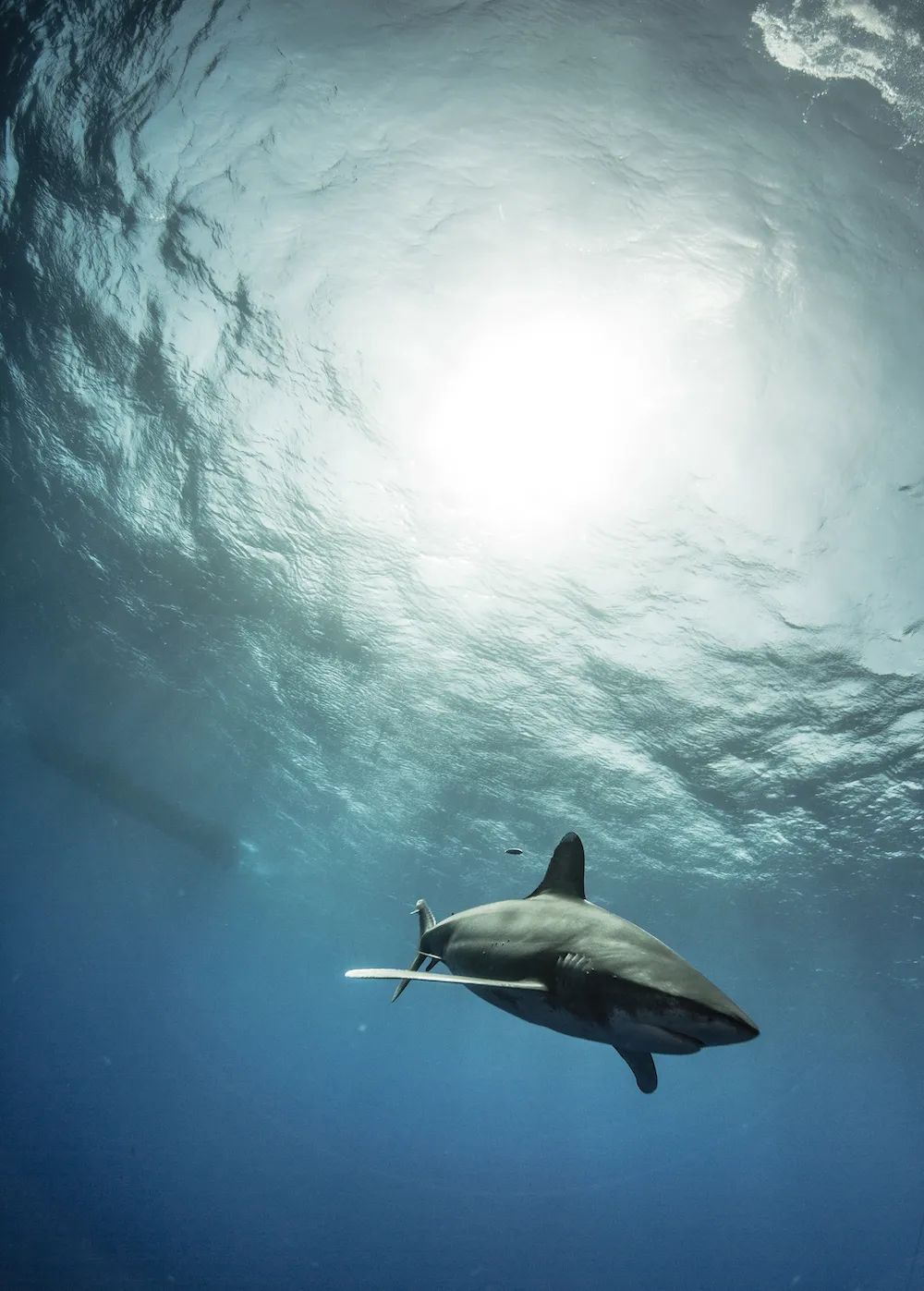 大洋白尖鲨是一种大型鲨鱼,背鳍、胸鳍和尾鳍的尖端都有白色的斑纹,因此被称为白尖鲨。通常生活在热带和亚热带地区。