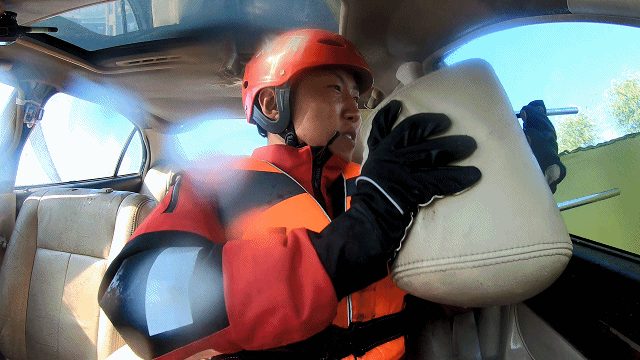 如果错过前面的逃生时机,别急,还有机会,车内人员可以等待水完全灌入车辆,车内外水压一致的那一刻,深吸一口气用力打开车门,如果车门还是打不开,尝试使用灭火器等重物猛砸,破窗几率更大,逃出后迅速游向水面寻求帮助。