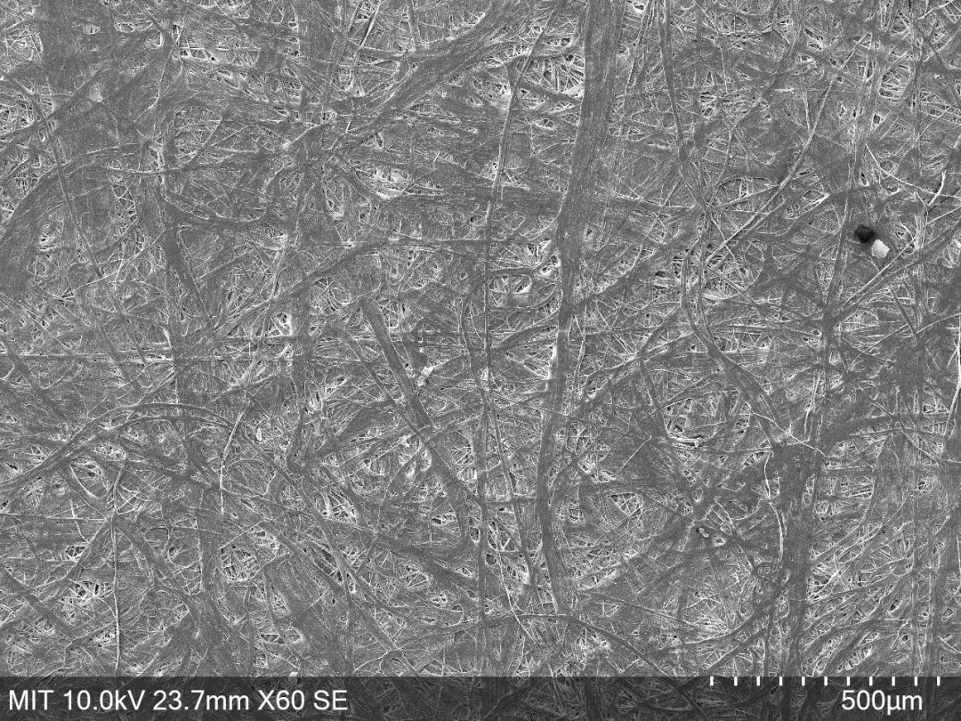 显微镜下的杜邦纸 | MIT Filter Media Database而另一方面,杜邦纸又是一种相当疏水的材料。它不会被水浸湿,也不会让液态水轻易渗透。因此,在包装完好的前提下,吸湿形成的溶液不会渗漏出来污染衣柜。
