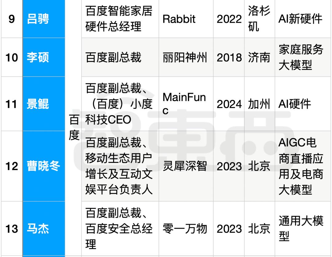 这些人包括原百度智能家居硬件总经理吕骋,原百度副总裁李硕,原百度副总裁、(百度)小度科技CEO景鲲,原百度副总裁、移动生态用户增长及互动文娱平台负责人曹晓冬,原百度副总裁、百度安全总经理马杰。