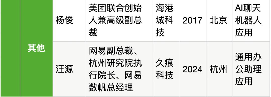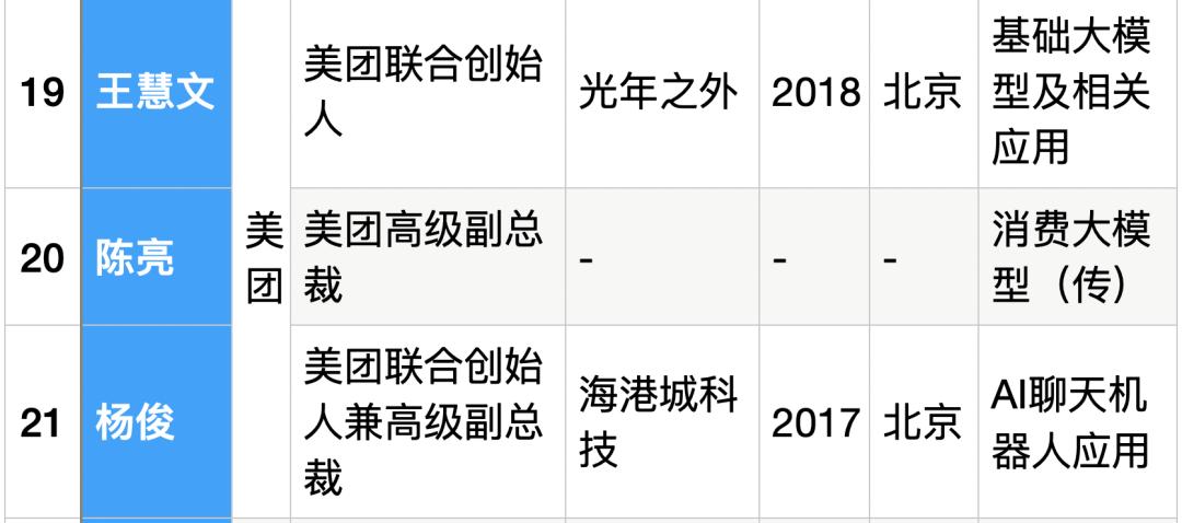 ▲美团联合创始人杨俊如下图所示,至少3位来自美团的大厂高管加入了生成式AI创业,包括:美团联合创始人王慧文、原美团高级副总裁陈亮、原美团高级副总裁兼联合创始人杨俊。
