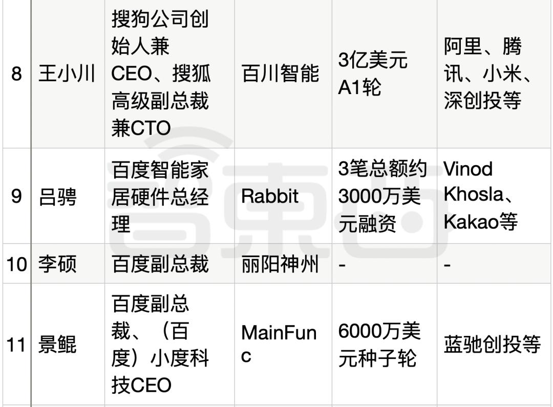 ▲原百度副总裁、小度科技CEO景鲲如下图所示,已经至少有5位来自百度的大厂高管投身生成式AI创业。
