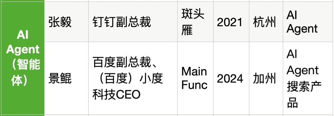 在AI Agent领域,最新曝出创业进展的原百度副总裁景鲲盯准AI Agent搜索产品赛道,这与年初获得了近千万美元A轮融资的原钉钉副总裁张毅,从企业服务企业,颇为不同,避开了直接竞争。