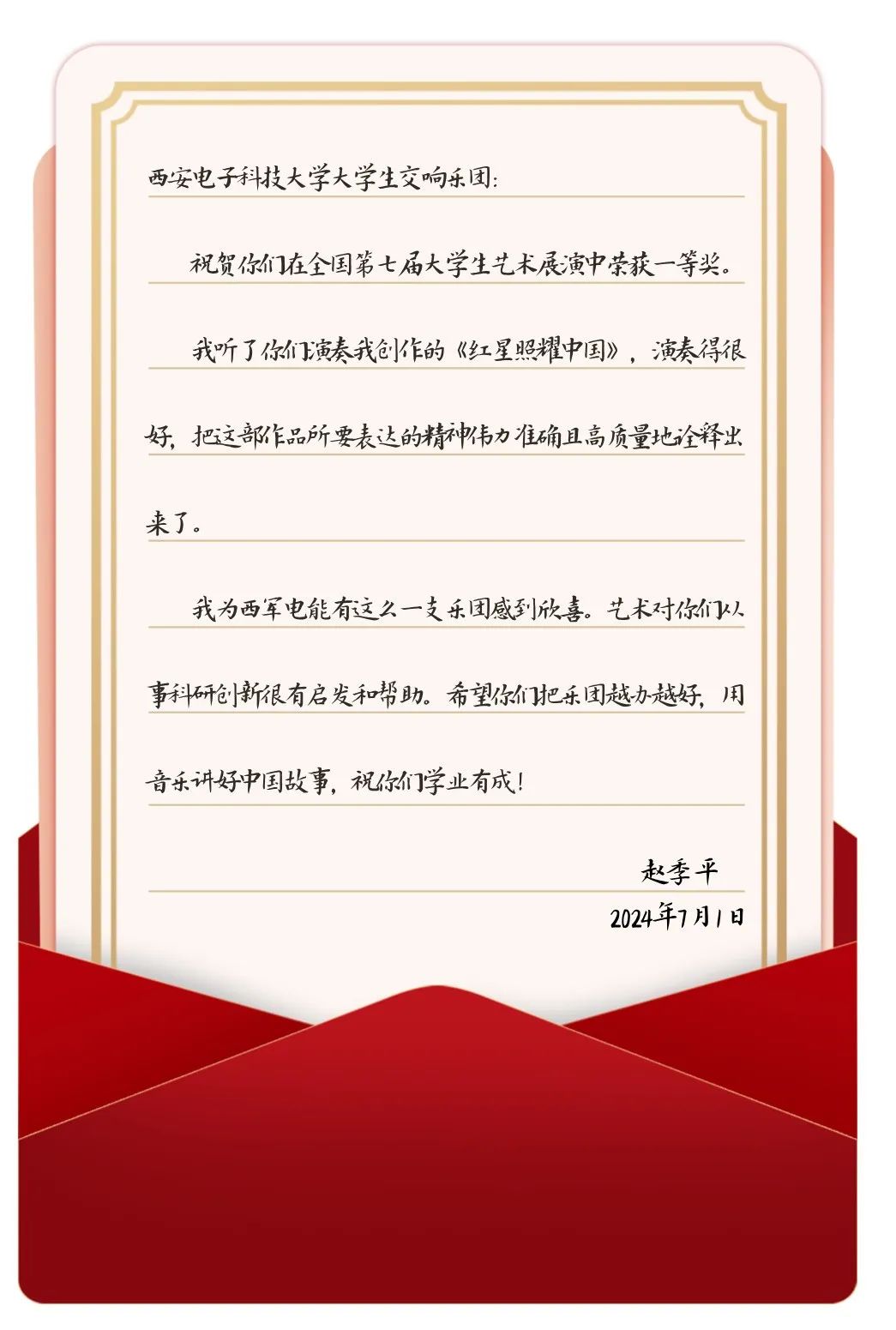 中国音乐家协会名誉主席、陕西省文联主席、著名作曲家赵季平向学校发来贺电。