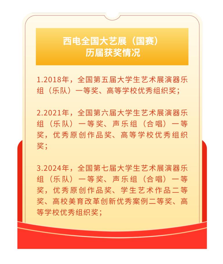 此次大艺展西电获奖级别与数量创历史最佳再次位列全国高校前列。其中,西电大学生交响乐团成为西北地区高校中唯一三次蝉联全国大艺展器乐组一等奖的高校学生乐团,西电大学生合唱团成为西北地区高校唯一蝉联两届全国大艺展一等奖的高校学生合唱团,也是本届展演陕西高校唯一入选全国展演并获一等奖的合唱团。
