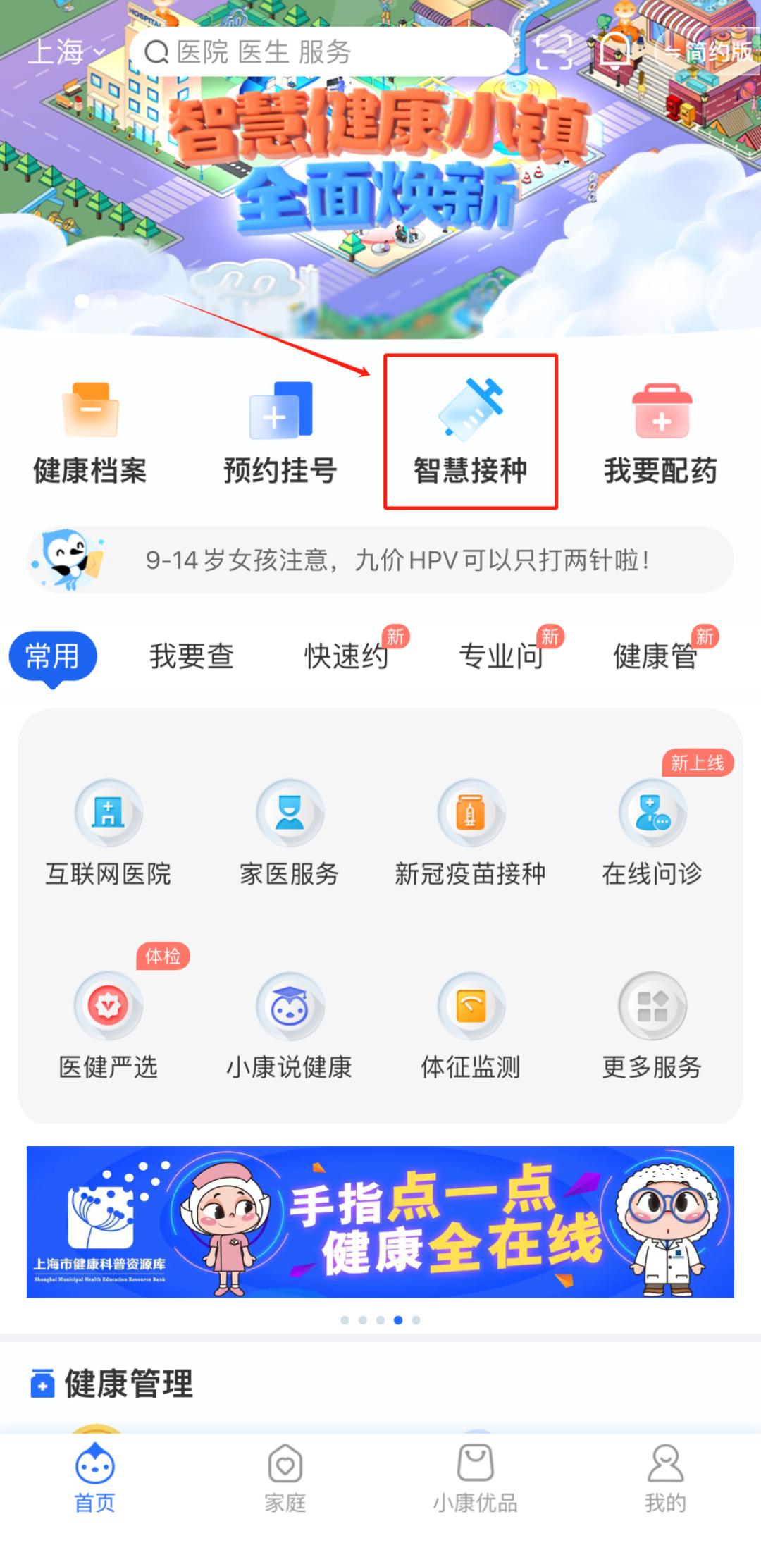 1. 注册登录:已持有本市预防接种证儿童的家长,可通过随申办或健康云的APP/微信小程序/支付宝小程序或“上海疾控”微信公众号-“服务信息”-“预约接种”跳转进入健康云服务画面的“智慧接种”模块。