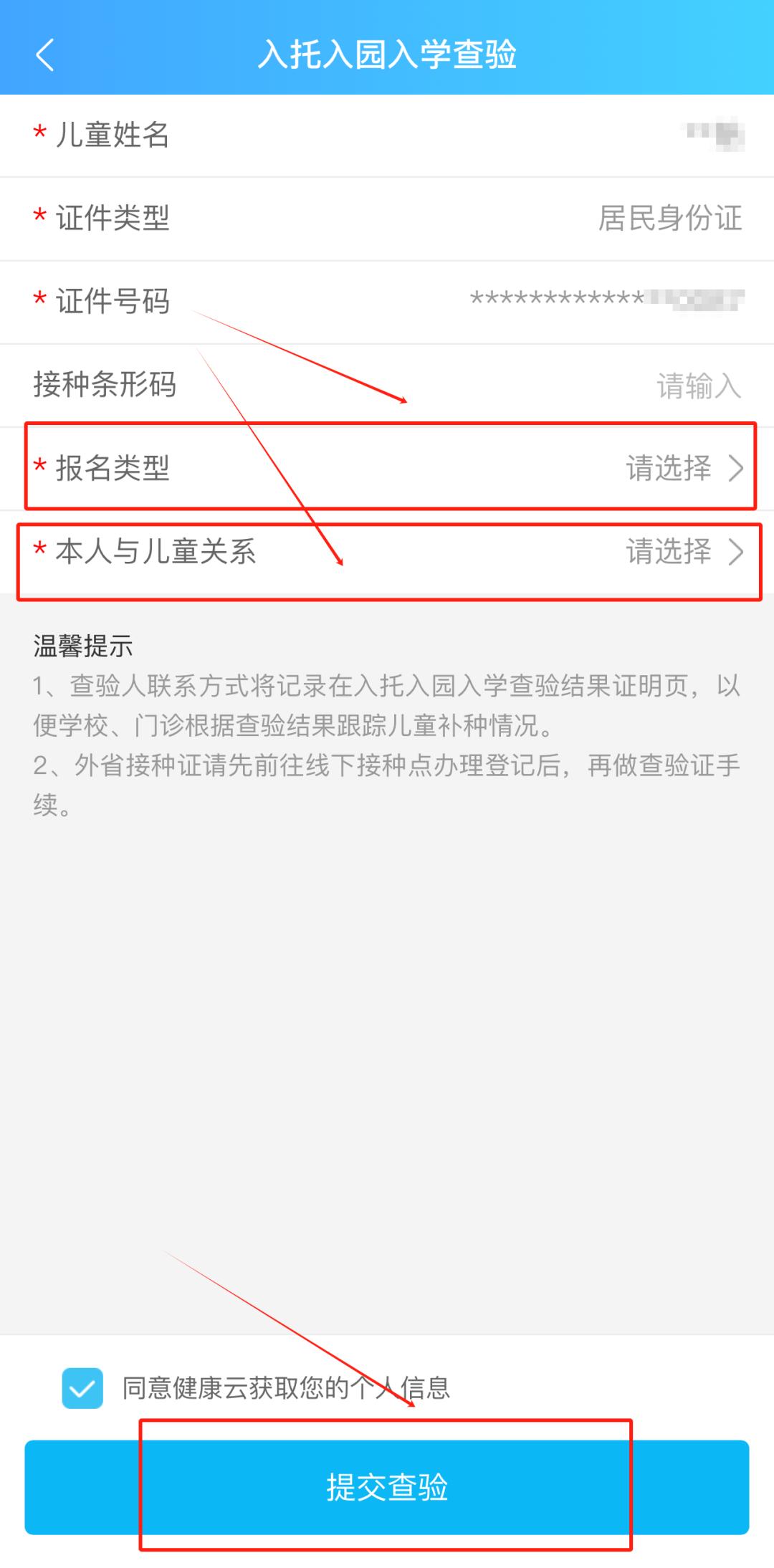 2. 查验儿童绑定:绑定儿童信息后,点击入托入园入学查验模块,准确填写儿童信息、报名类型及与儿童的关系,提交查验。