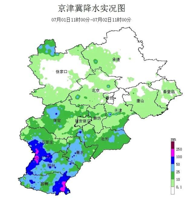 河北省气象台2024年7月2日11时发布暴雨蓝色预警信号:目前石家庄西南部、邢台西部、邯郸东部已出现50毫米以上降水,今天上午降水仍持续。预计今天白天到夜间,唐山、秦皇岛、廊坊南部、沧州、衡水、邢台东部、邯郸东部将出现中到大雨(累计雨量15-40毫米),部分地区有暴雨(累计雨量50-90毫米),降雨时局地伴有雷电、短时强降水、短时大风等强对流天气,请注意防范。