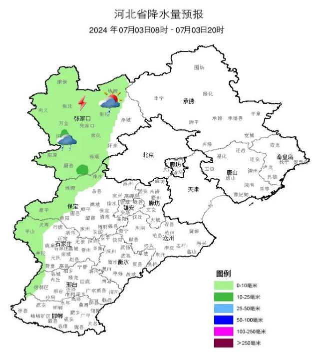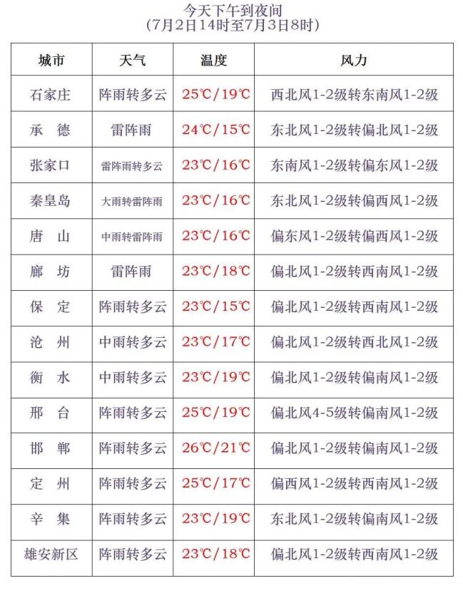 今天下午到夜间,全省阴有阵雨或雷阵雨,其中唐山、秦皇岛、沧州、衡水、邢台东部、邯郸东部有中到大雨,部分地区有暴雨,降雨时局地伴有雷电、短时强降水、短时大风等强对流天气。