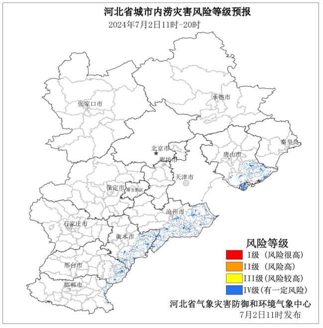河北省气象灾害防御和环境气象中心2024年7月2日11时发布城市内涝风险等级预报:今天白天,唐山东南部、沧州东部、衡水东部、邢台东部、邯郸东部等地的局部地区城市内涝风险等级为IV级,有发生城市内涝的风险,请注意防范。