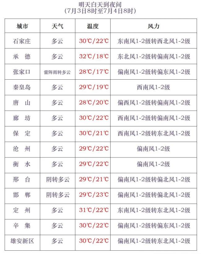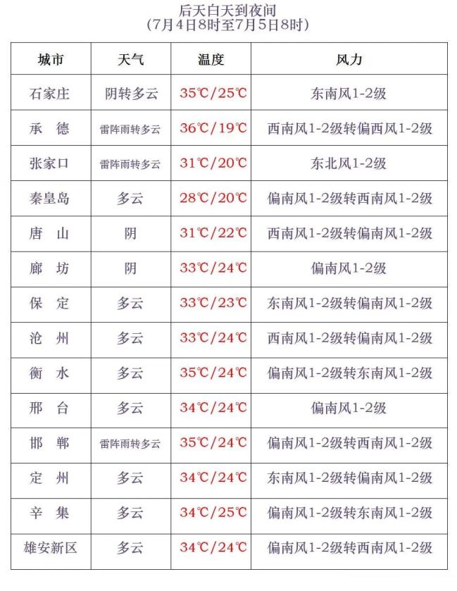 4日夜间到5日,张家口、保定、雄安新区、石家庄、沧州、邢台西部多云转阴有雷阵雨或阵雨,其他地区多云。