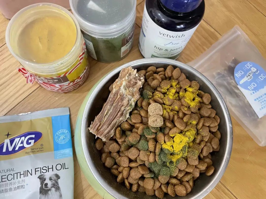 自制添加了各种营养素的狗狗餐食。(图/受访者提供)养了两只高龄犬的宠物博主Y对此持谨慎态度。她从来不接宠物保健品广告。她认为,一只健康的狗不需要吃过多保健品:“保健品需要肝肾代谢,这也是老年犬最容易出现问题的两个器官,少喂保健品其实是对老龄犬最好的保养。与其花钱给宠物买不必要的保健品,不如把这个钱省出来每年给宠物进行体检。如果确定某方面有问题,再有针对性地给它服用保健品或药品,我认为这才是一个科学的养犬思路。”