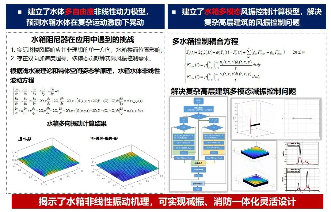 △项目创新点:高层建筑水箱TLD风振控制技术针对高层建筑抗风减振问题,抗风团队开展了大比例水箱的振动台模拟实验,开发了提高水体耗能率的附加阻尼装置,研发了水箱多自由度运动分析软件,解决了分布式多水箱的多模态风振控制难题,在水箱偏置减振、多水箱协同工作和连体复杂高层水箱减振等方面取得技术突破。研究成果近年来在深圳招商银行总部大厦等实际工程中推广应用,取得了良好效果。