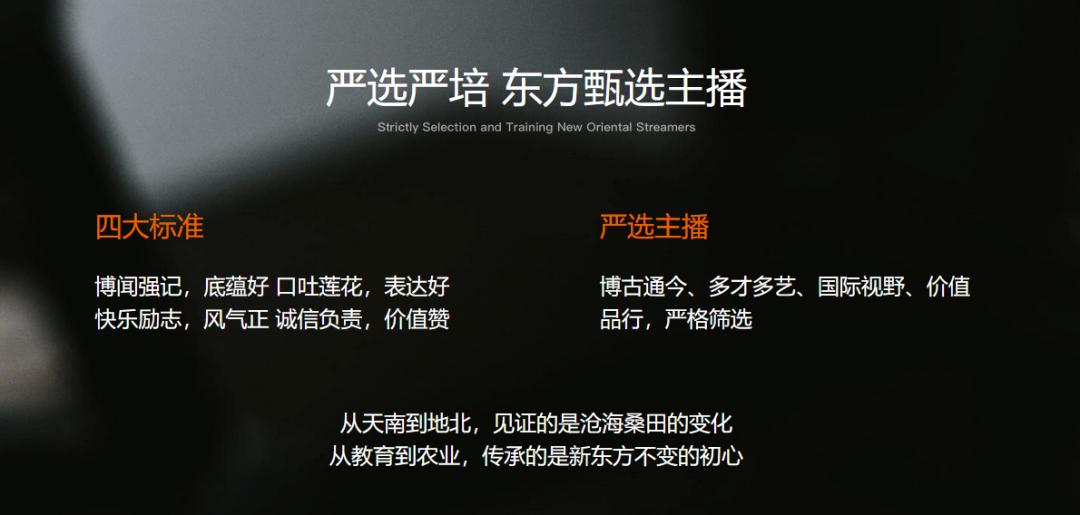 东方甄选对主播的要求存在“四大标准”——“博闻强记,底蕴好;口吐莲花,表达好;快乐励志,风气正;诚信负责,价值赞”,进入直播间的主播需要经过“博古通今、多才多艺、国际视野、价值品行”的严格筛选。