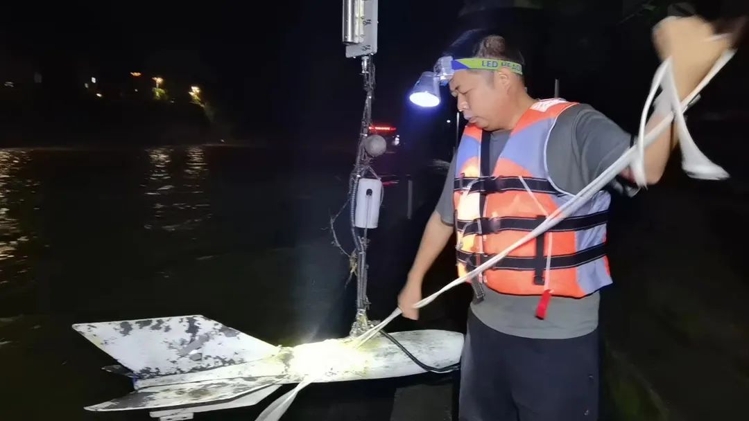 6月29日,黔东南州水文水资源局应急监测队员夜间在镇远县大菜园水文站测流。(杨佳运 摄)17时许,创历史新高的洪峰终于到达镇远河段。实际结果显示,当时洪峰水位达到465.33米,超保证水位4.33米,与预报值(4.5米)仅相差0.17米,与预报洪峰到达时间基本吻合,并且提前预报了4.5个小时。