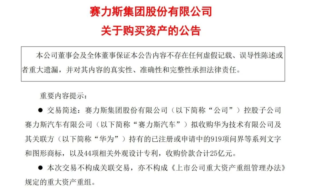 据汽车公社报道,7月2日晚间,赛力斯集团发布公告称其子公司赛力斯汽车将斥资25亿元,收购华为919项问界等系列文字和图形商标,以及44项相关外观设计专利。这一消息引起了广泛关注和讨论。