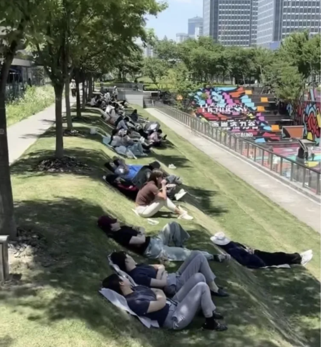 还有最近在“社畜圈”里大火的徐汇滨江跑道公园。一片阶梯形状的草坪,即使在工作日的时间,这里也能看到各种各样的睡姿和坐姿,有熟睡的外卖小哥,有盘腿在笔记本电脑上打字的白领,也有摆pose相互拍照的嬉闹情侣。