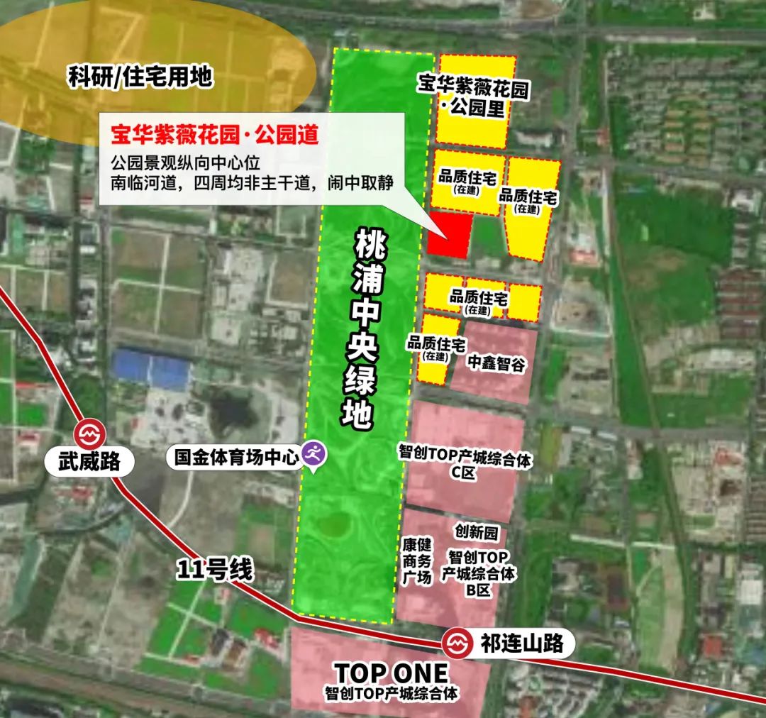 桃浦智创城在建的商业、办公均集中在11号线祁连山路站的北面,与绿地融为一体,离宝华紫薇花园·公园道依然是步行可达。
