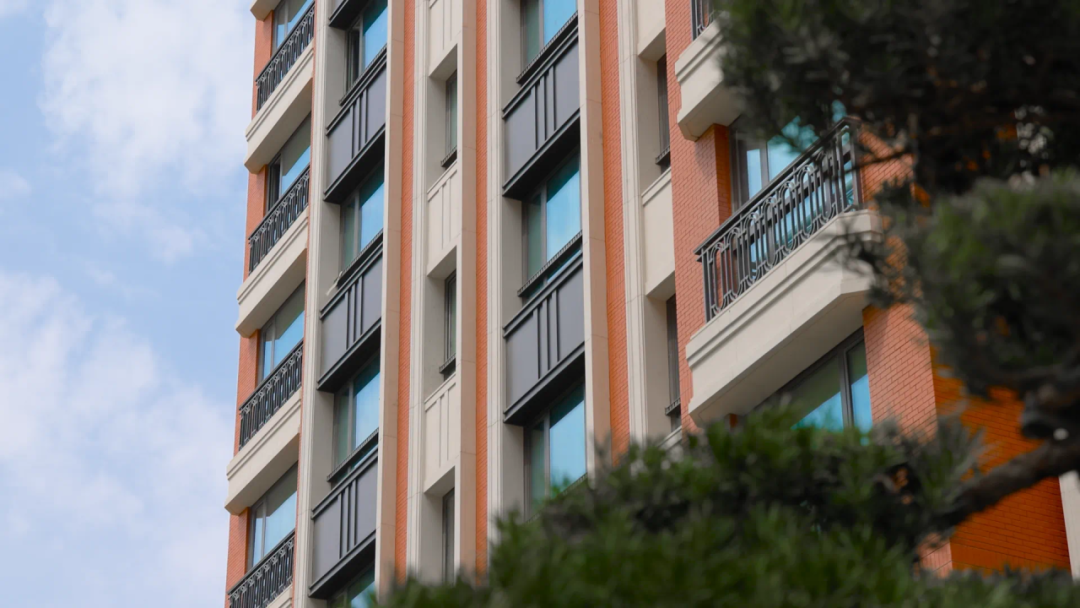 首先是建筑造型。爱和陶红砖搭配沉香米黄石材干挂,再造海派风情。