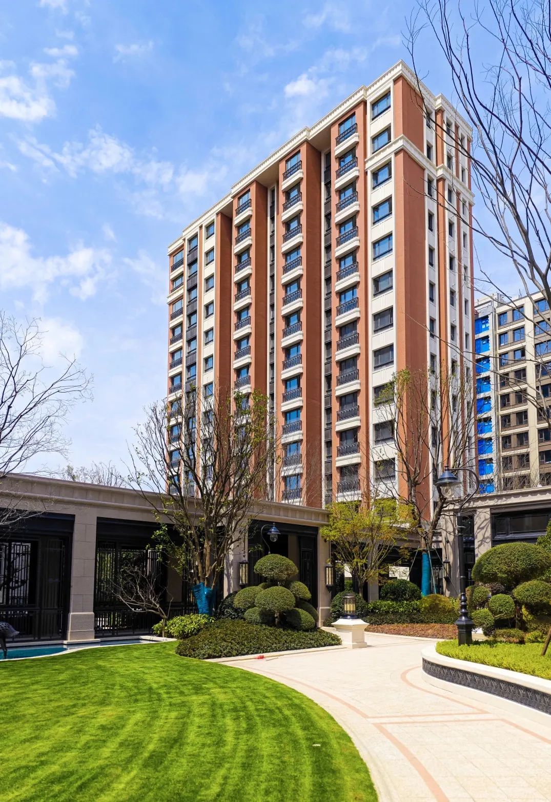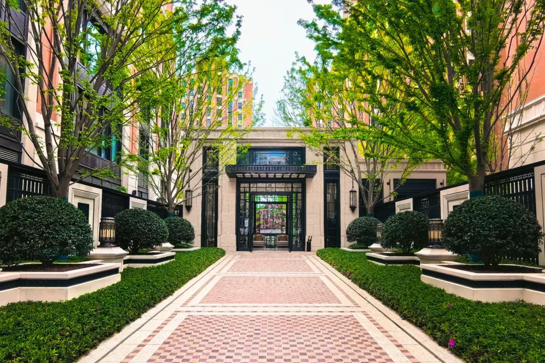 景观上,宝华标志性的宫廷中轴景观和大草坪延续了桃浦中央绿地,由内而外,自然呈现。在树种的选择上,全冠移植的名贵绿植郁郁葱葱。