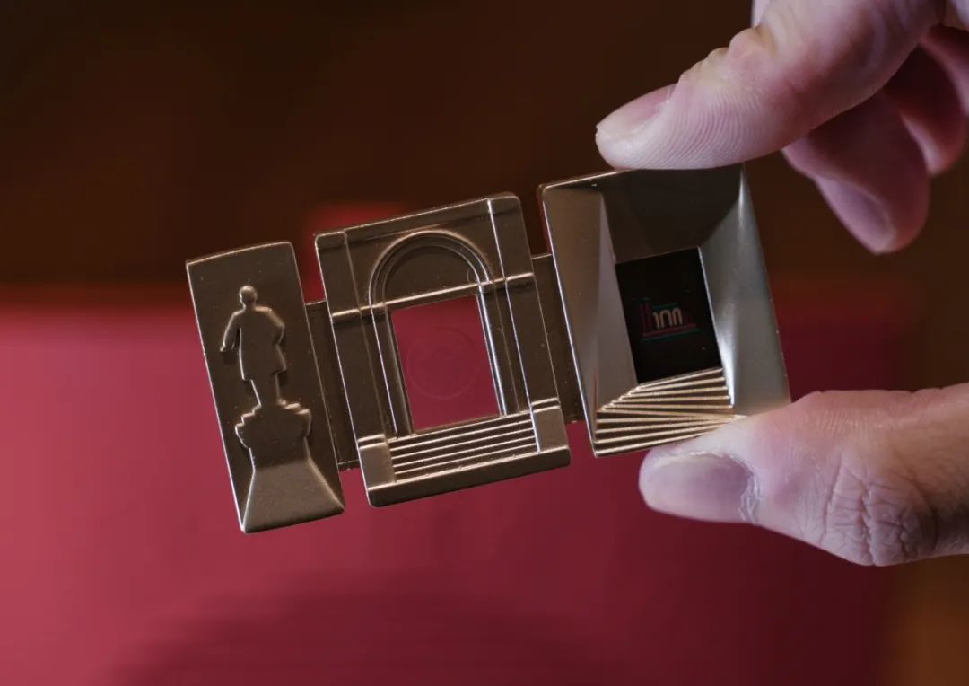 礼盒中金色的“世纪之门”徽章以数字“100”的形态汇聚光影