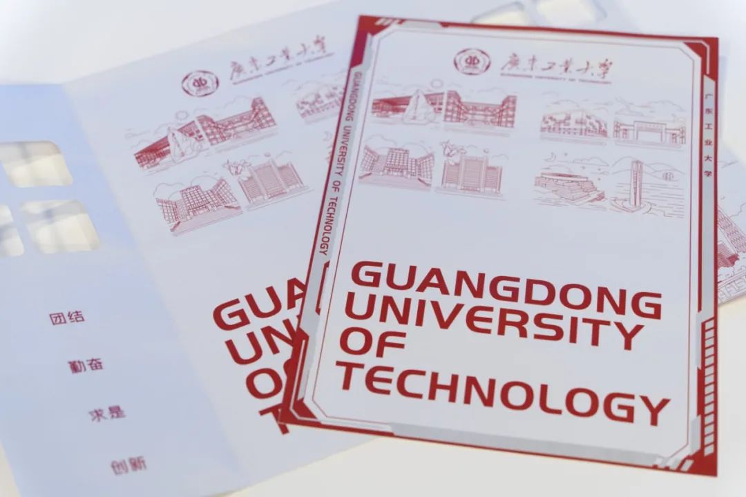 广东工业大学2024年的通知书礼盒整体采用红白灰的简约配色