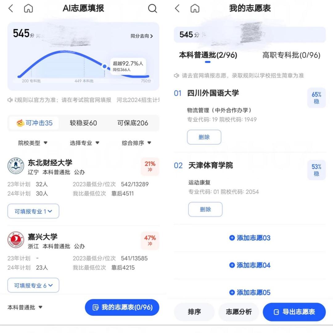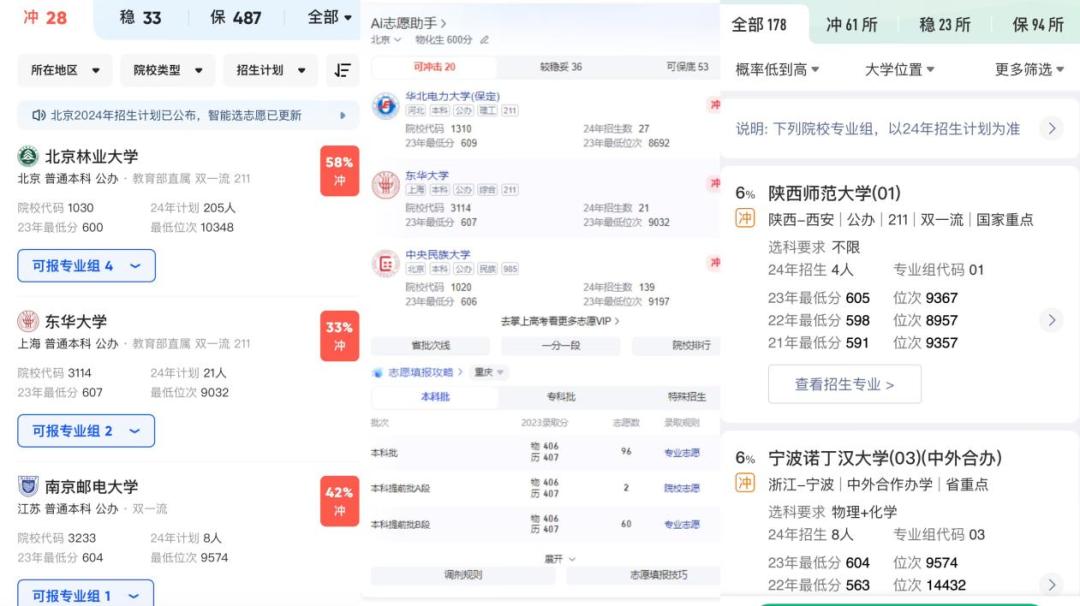 “最大的体验感受就是提升了筛选效率,以前都是摸着老师和学长学姐的经验过河,现在多了辅助工具也是科技带来的便利”。常宇是河北人,这次女儿考了545分,在出分后的第一时间他就用上了AI志愿报考服务,“我把数字和排名还有她考试科目输入后有了三个档位,一个是概率高的学校推荐,一个是比较稳的学校推荐,还有一个保底的,然后我们在里面筛选。”