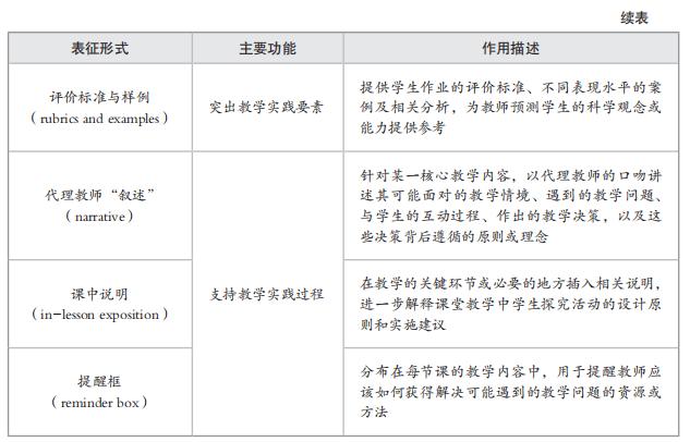 表1呈现的教育性特征可以为教师提供教学实践要素和教学实践过程等方面的支持。例如,“内容故事线”在单元学习之前通常会为教师提供显性的知识发展脉络,以帮助他们深入、系统地整理教学思路和规划学生的学业发展路径;“评价标准与样例”则能指导和支持教师对学生进行及时、合理的形成性评价,以促进学生的知识学习与能力发展;具有“为什么-如何”文本的课程材料则会通过联系学生的已有知识和能力水平等来解释该课程是如何进行组织和呈现的,以及为什么这样做,以指导和影响教师的教学实践决策。总之,教育性课程材料对教育性特征的合理使用有利于教师学习和发展学科知识(content knowledge)(如故事线、实验概览等的使用)、教学知识(pedagogical knowledge)(如“为什么-如何”文本、评价标准与样例等的使用),以及学科教学知识(pedagegical content knowledge)(如代理教师“叙述”、课中说明等的使用)。